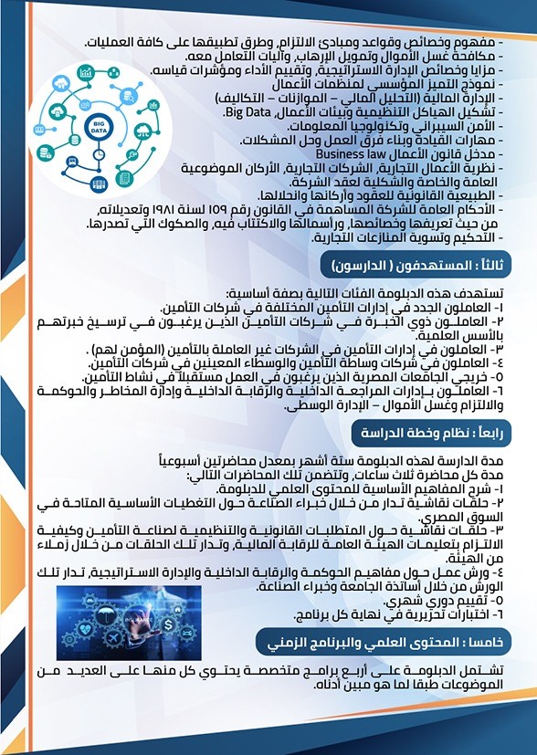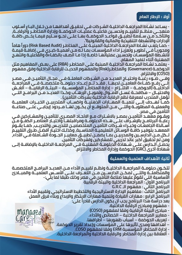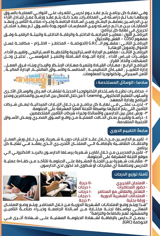 وفي ضوء رغبة واحتياج العديد من الشركات العاملة في مجال التأمين في مصر إلى رفع كفاءة العامين لديها ، فقد تم إعداد دبلومة متخصصة في المراجعة الداخلية (الحوكمة – الالتزام – إدارة المخاطر المؤسسية – البيئة الرقابية – الغش والاحتيال – مكافحة غسل الأموال وتمويل الإرهاب وكذا العديد من البرامج التي تؤهل المتدرب لمعرفة نظم الرقابة الداخلية بشركات التأمين) .